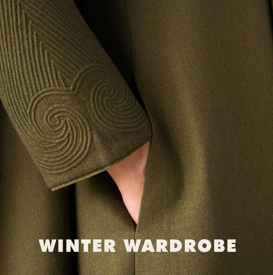 Winter begin with a selection of pure wool, chosen for its quality and warmth. Once the fabric is cut, the patient work begins. Our labels are sewn by hand, one stitch at a time, because that is the only way to achieve the clean finish we love. Blind hems are worked precisely, invisible to the eye.