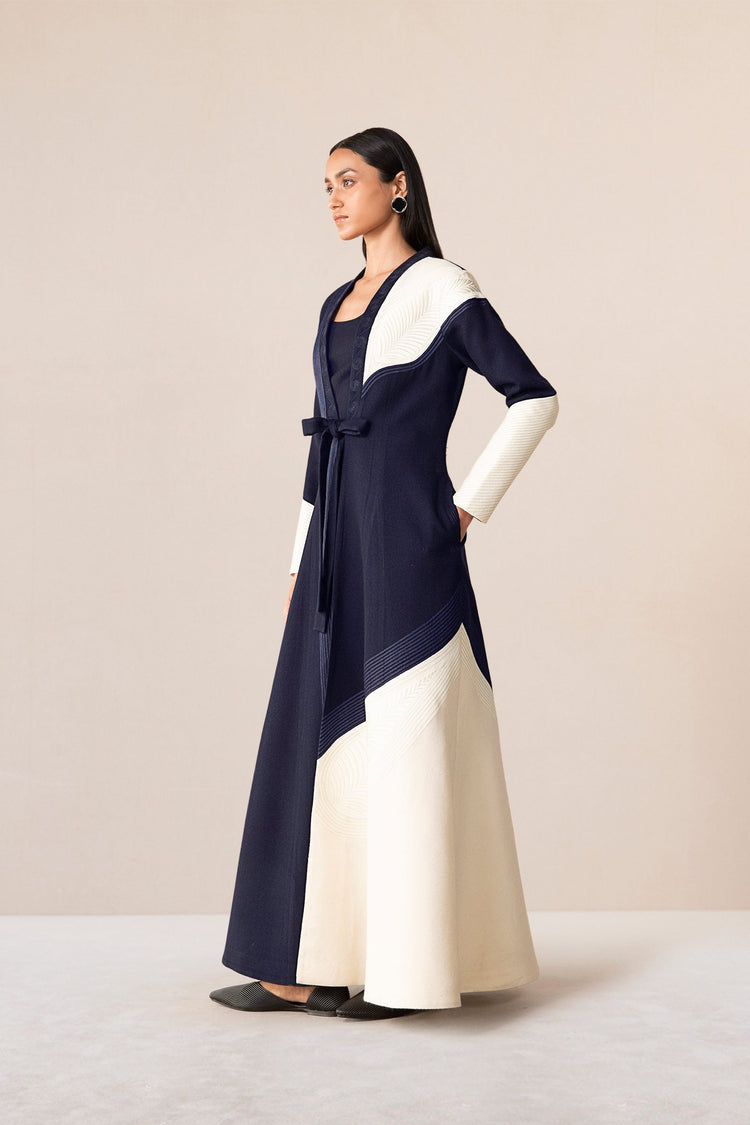 The Faiz jacket is a masterpiece of embroidery, lace and colour-blocking. The navy and ivory of the soft wool contrast against the delicate dori embroidery on along the opening of the jacket and the cuffs of the hem, with meticulously stitched lace curving around the jacket. Two belts of fabric in the front allow the jacket to be tied together.