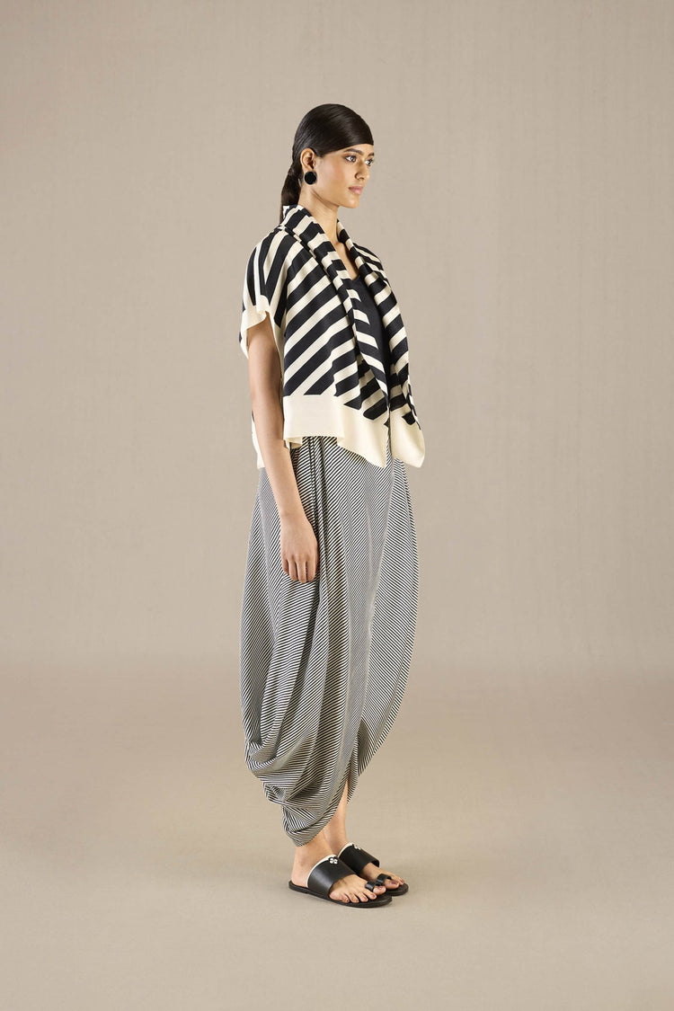 Everyone wants the stylish and easy-to-wear Safiya jacket set. The drapes of the striped rose silk jacket fold themselves to form a clever lapel and the dhoti pants feature pleats that drape gracefully. With a playful enamel pin featuring the collection's signature motif, the Safiya set is the perfect outfit for all your staycation needs.