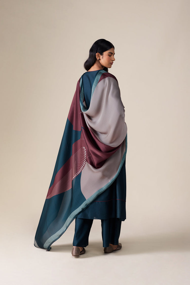 "The deep stormy blue cotton silk of the Milap kurta flares in a smooth line, ending in an asymmetrical hem with burnt red piping that adds a quiet charm to every seam. AMPM’s signature paan lead motif rendered in the same red cording on the sleeve captures attention in an effortless manner, complementing the colour blocking and graceful lines of the matching dupatta.